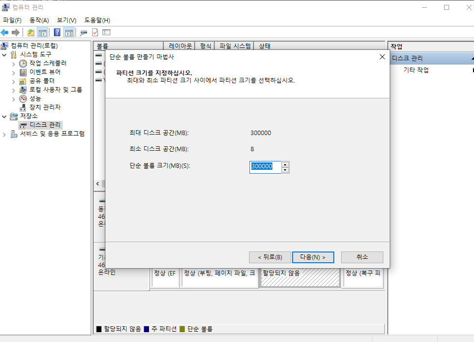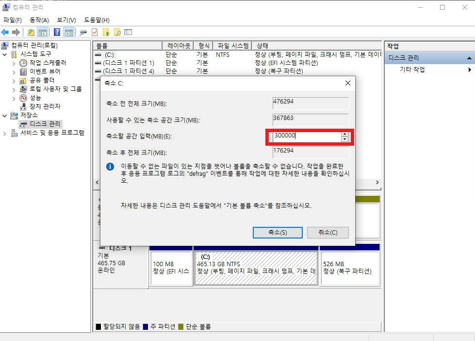 저의 경우 300GB의 D 드라이브를 새로이 만들고자 하니 [축소할 공간 입력]에 3000000을 입력합니다. (1GB = 10000 MB, 100GB = 1000000 MB)