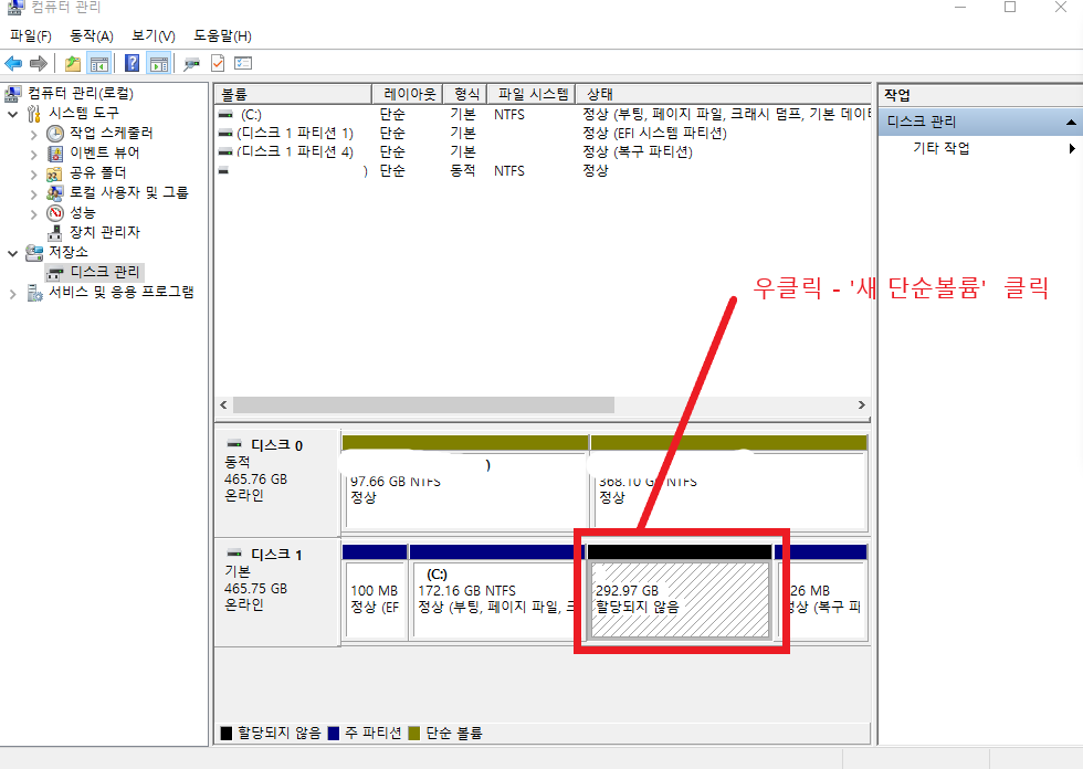여기를 '우클릭' 한뒤 [새 단순 볼륨]을 클릭하여 실행합니다.