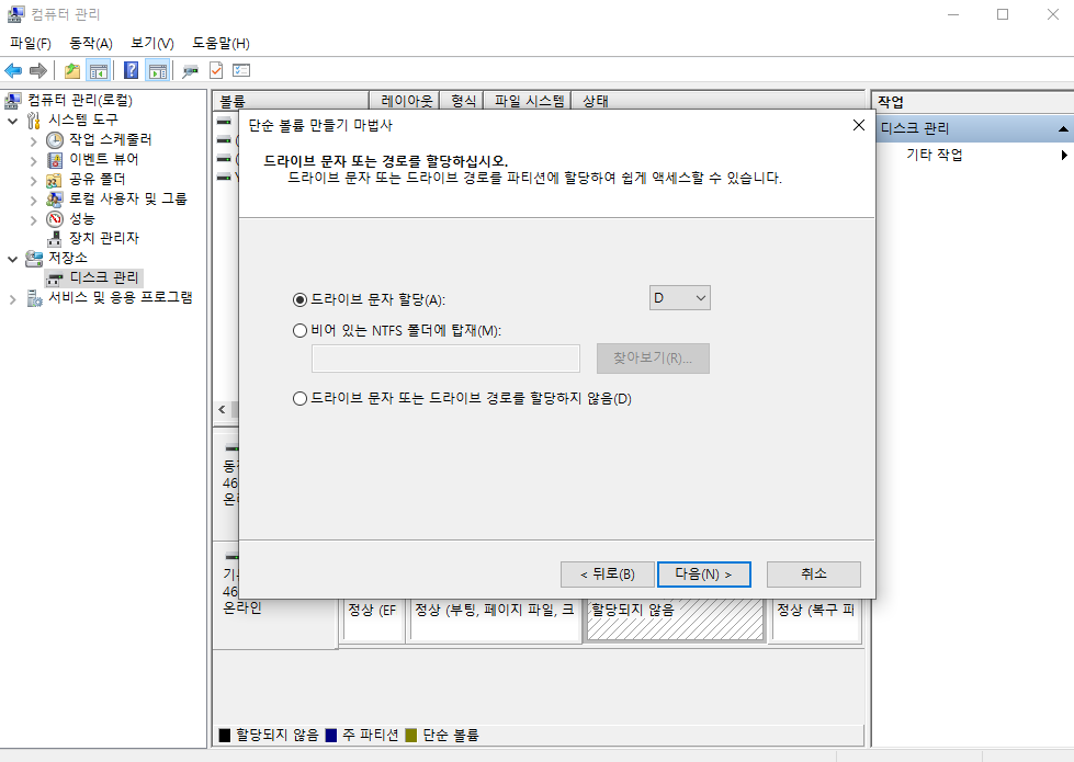 6. 드라이브 문자할당 창이 뜨는데, D 드라이브로 할지 F 드라이브로 할지를 선택합니다.