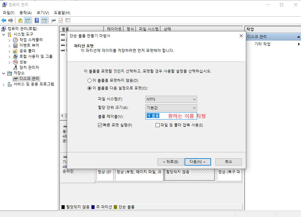 하지만 여기서 새로 만든 드라이브의 이름을 지정해주고 싶다면 [볼륨 레이블]에서 원하는 이름을 지정해주면 됩니다.